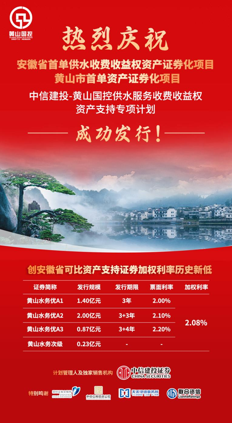 3月24日,黄山国控集团“中信建投—黄山国控供水服务收费收益权资产支持专项计划”在深交所成功设立并发行,发行规模4.5亿元,加权利率2.08%,创全省同类产品利率新低。该项目实现“双首单”突破,既是安徽省首单水务收益权ABS项目,也是黄山市首单ABS项目,一举填补省市两级相关领域融资产品空白。